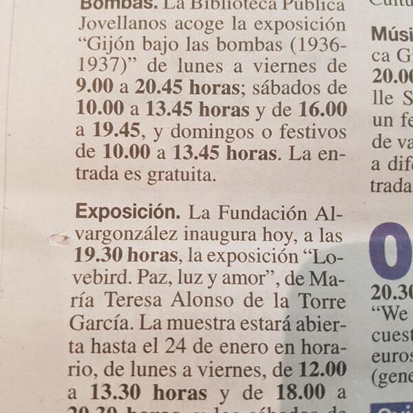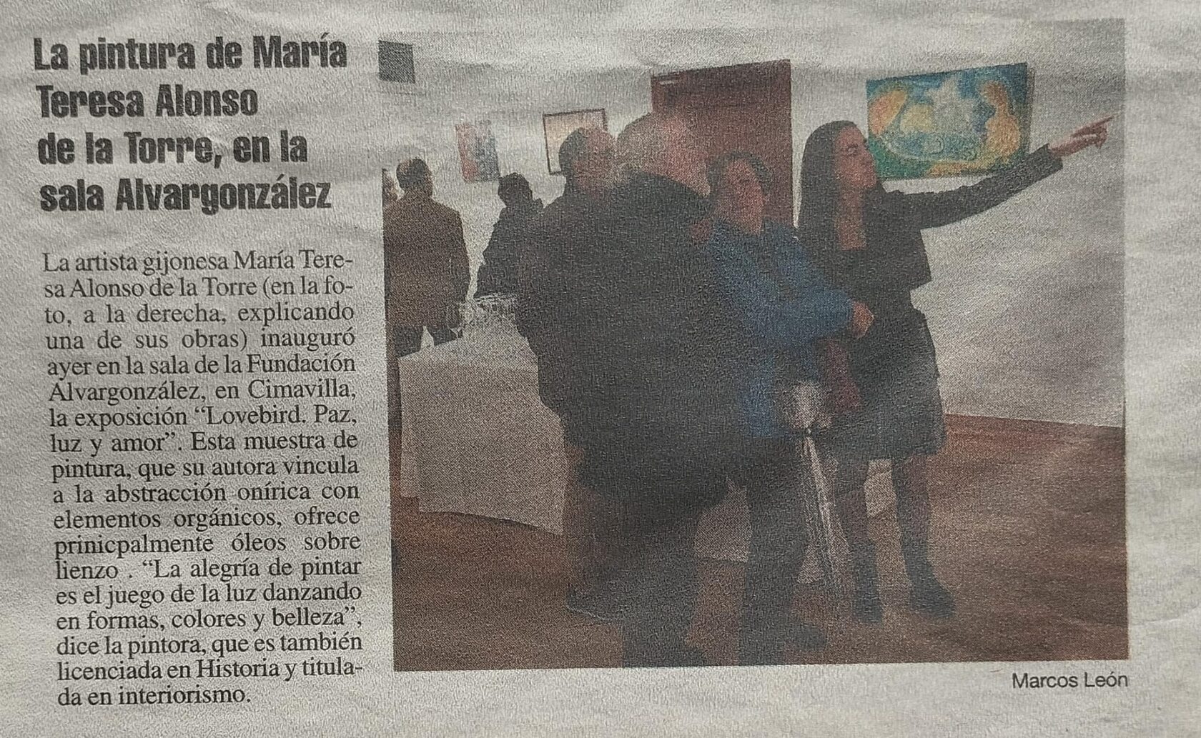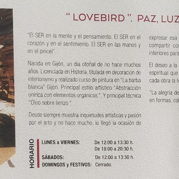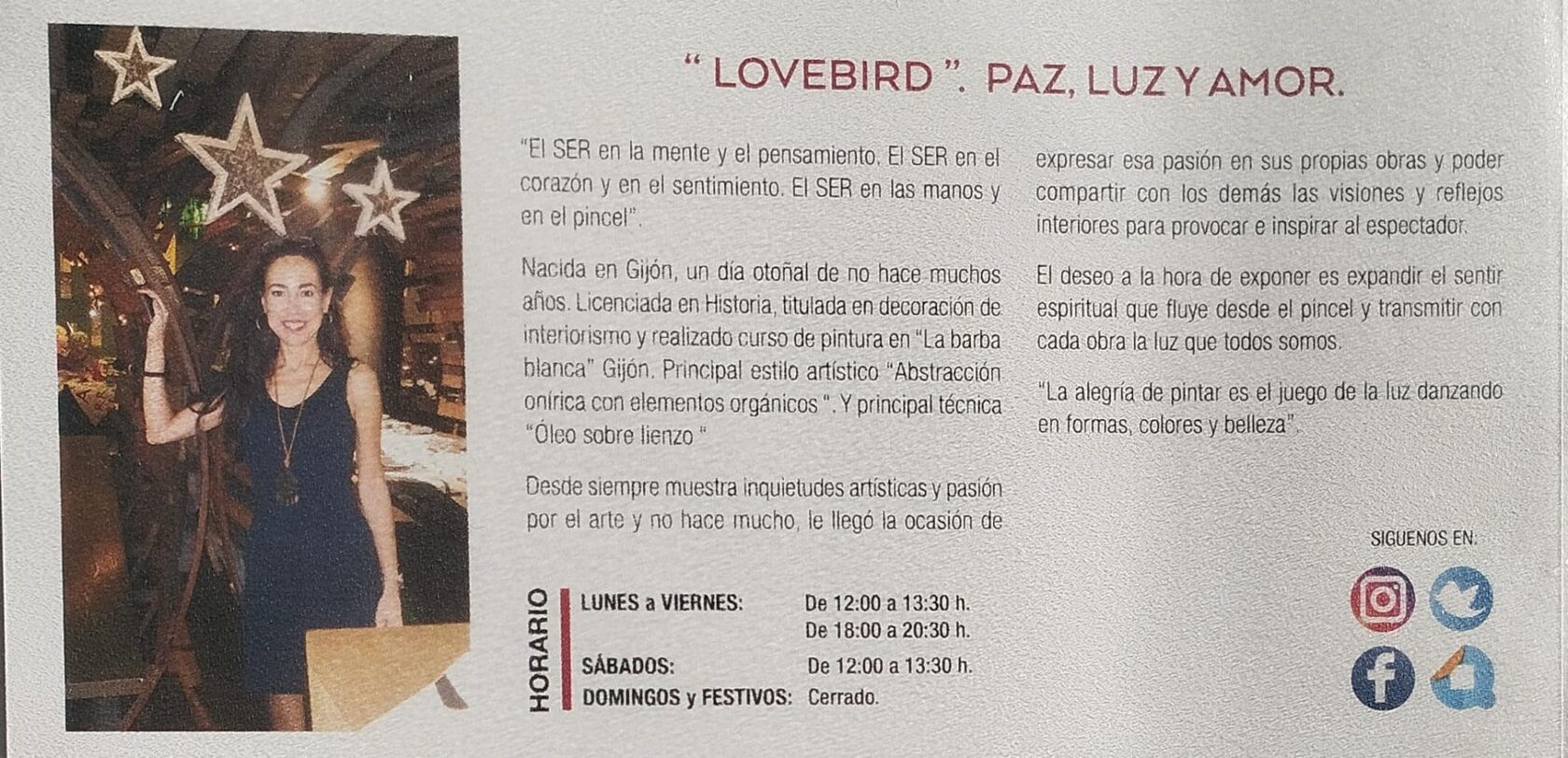La Fundación Alvargonzález inaugura hoy a las 19:30h La Exposición Titulada "Love Bird, Paz, Luz y Amor" de María Teresa Alonso de La Torre García. La muestra estará abierta hasta el 24 de enero en horario, de lunes a viernes de 12:00h a 13.30h y de 18:00h a 20:30h. y los sábados de 12:00h a 13:30h. La entrada es Libre.